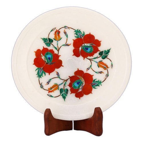 Decorative Wall Plate, White Marble Inlaid With Semi Precious Gemstones, Floral Pietra Dura Inlay Craft Work, Handmade Serving Plate