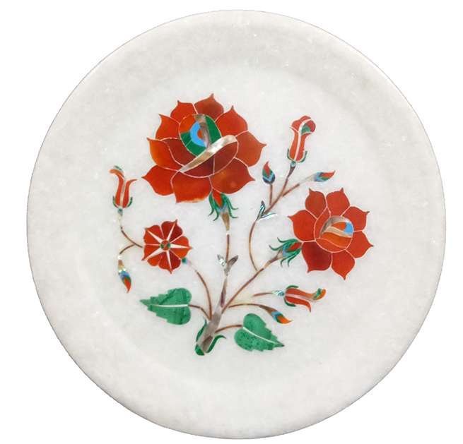 Decorative Wall Plate, White Marble Inlaid With Semi Precious Gemstones, Floral Pietra Dura Inlay Craft Work, Handmade Serving Plate