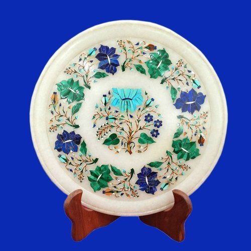 Decorative Wall Plate, White Marble Inlaid With Semi Precious Gemstones, Floral Pietra Dura Inlay Craft Work, Handmade Serving Plate