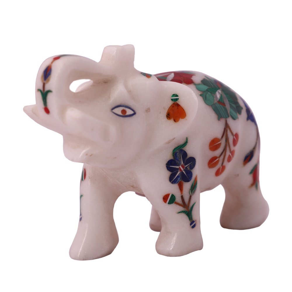 Solid White Marble Elephant Statue Inlaid With Semiprecious Stones