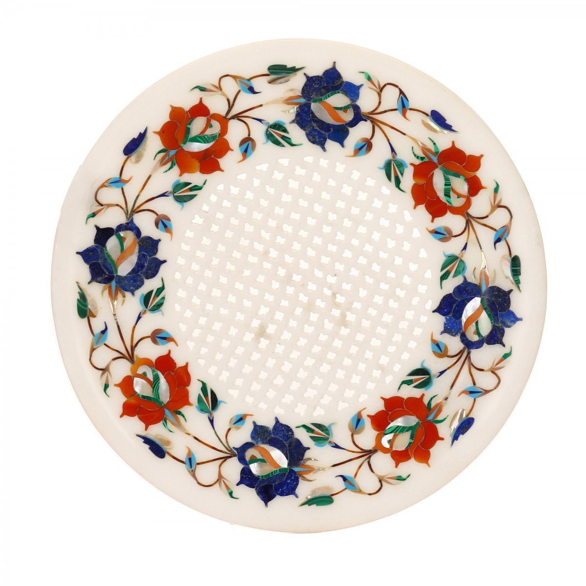 Decorative Wall Plate, White Marble Inlaid With Semi Precious Gemstones, Floral Pietra Dura Inlay Craft Work, Handmade Serving Plate