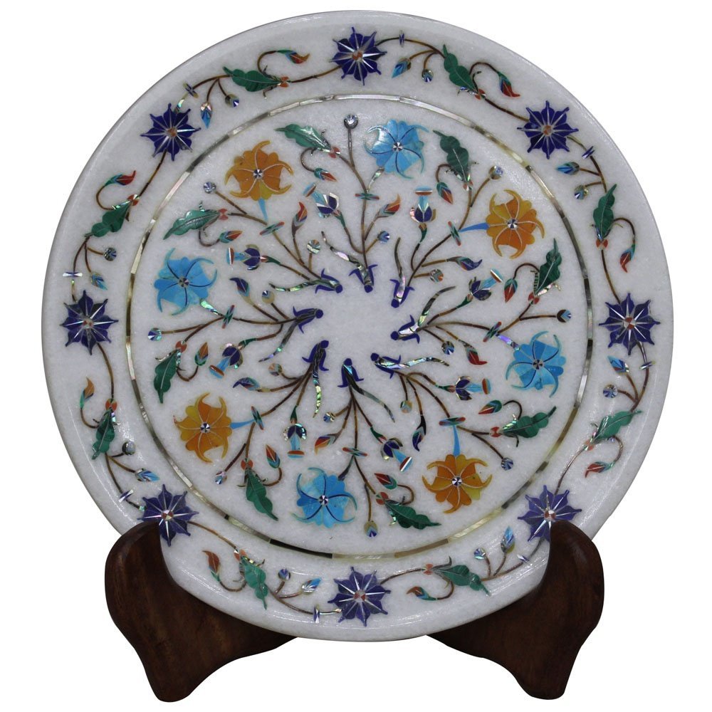 Decorative Wall Plate, White Marble Inlaid With Semi Precious Gemstones, Floral Pietra Dura Inlay Craft Work, Handmade Serving Plate
