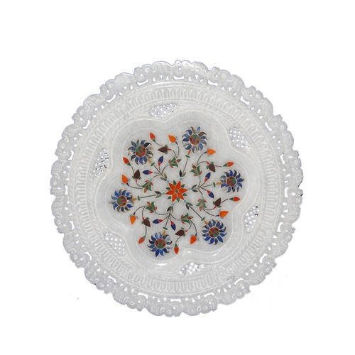 Decorative Wall Plate, White Marble Inlaid With Semi Precious Gemstones, Floral Pietra Dura Inlay Craft Work, Handmade Serving Plate